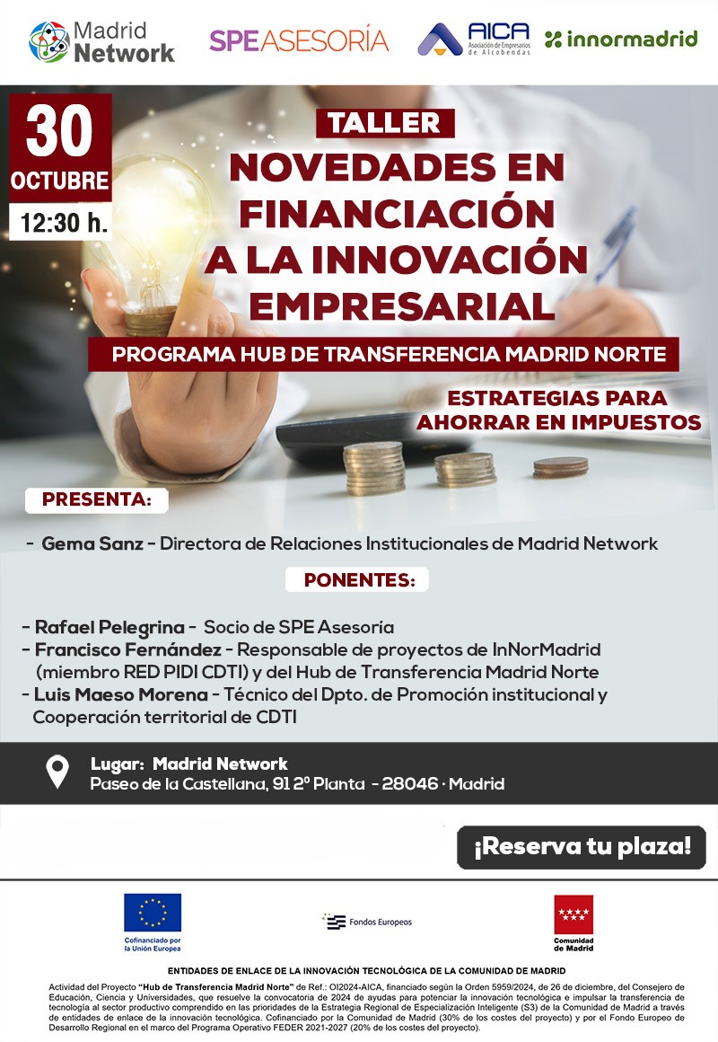 El próximo 30 de octubre a las 12:30h, te invitamos a conocer las últimas novedades y oportunidades de apoyo a la I+D+i empresarial en el taller que celebramos en la sede de Madrid Network.